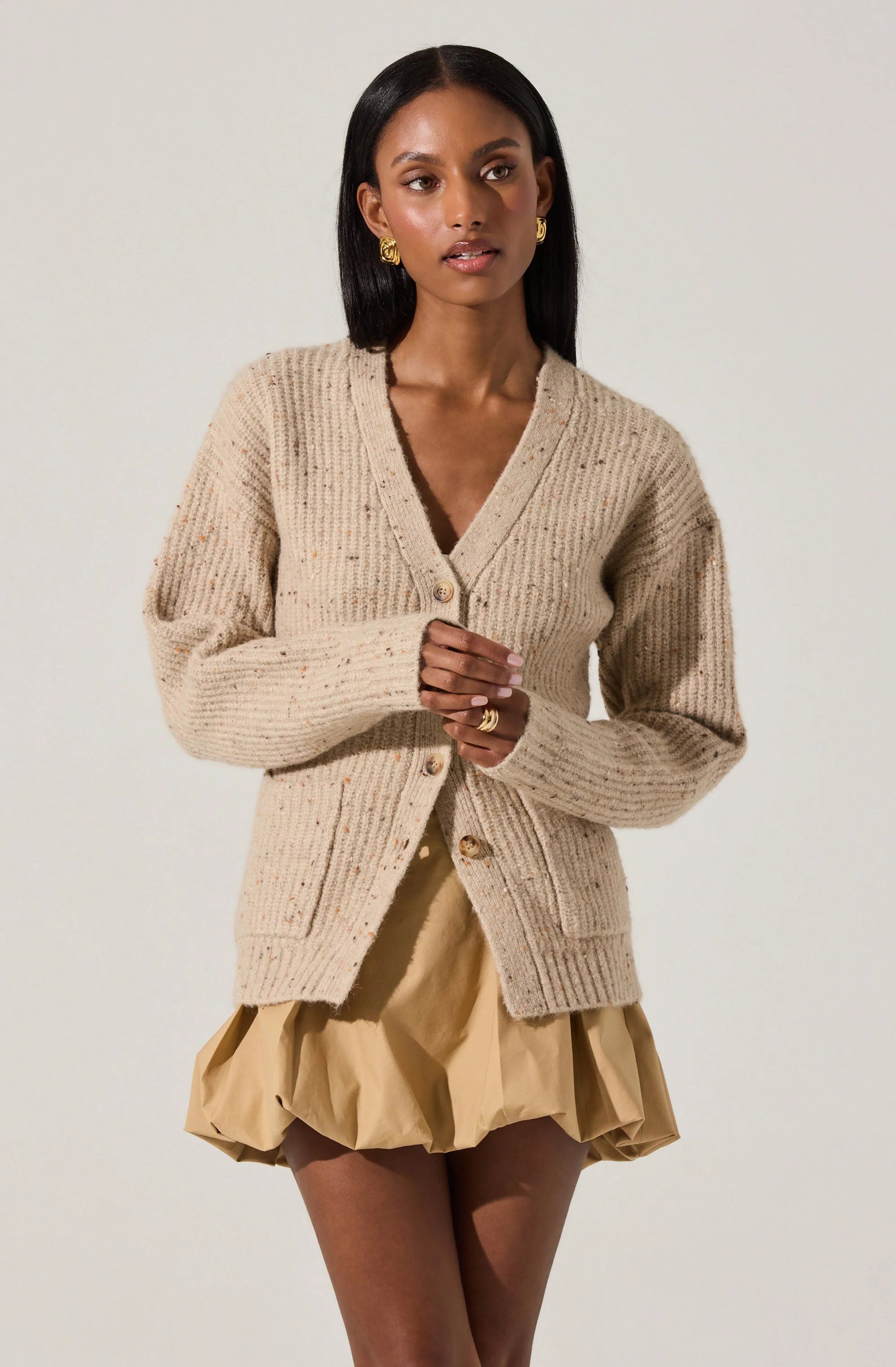 This ribbed cardigan features a V-neck design and front patch pockets, secured with a button-down closure.