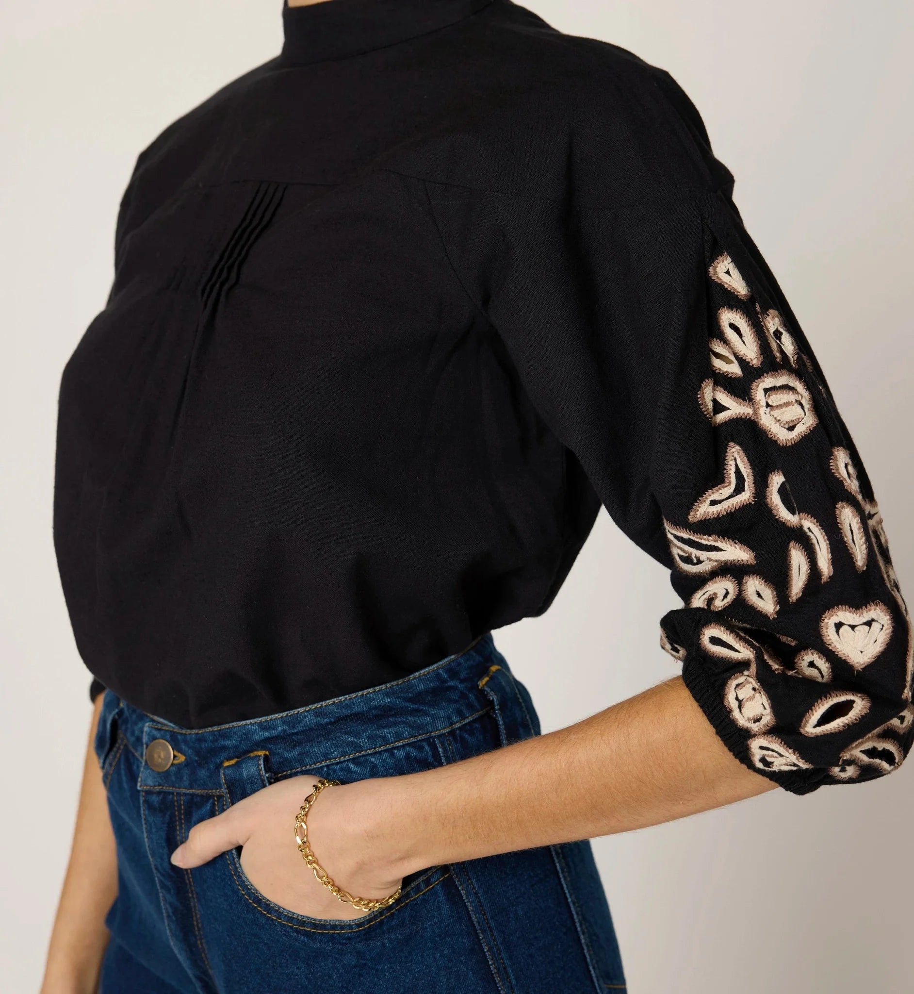 The Clarissa Blouse is effortlessly chic and sustainably crafted, ethically handmade in India from a breathable cotton-linen blend. This timeless blouse features elasticated 3/4 sleeves with delicate embroidery, pintuck detailing at the front, and a keyhole button closure at the back for a polished finish. Lightweight and versatile, the Clarissa Blouse pairs beautifully with denim or skirts, making it an elegant staple for any season.