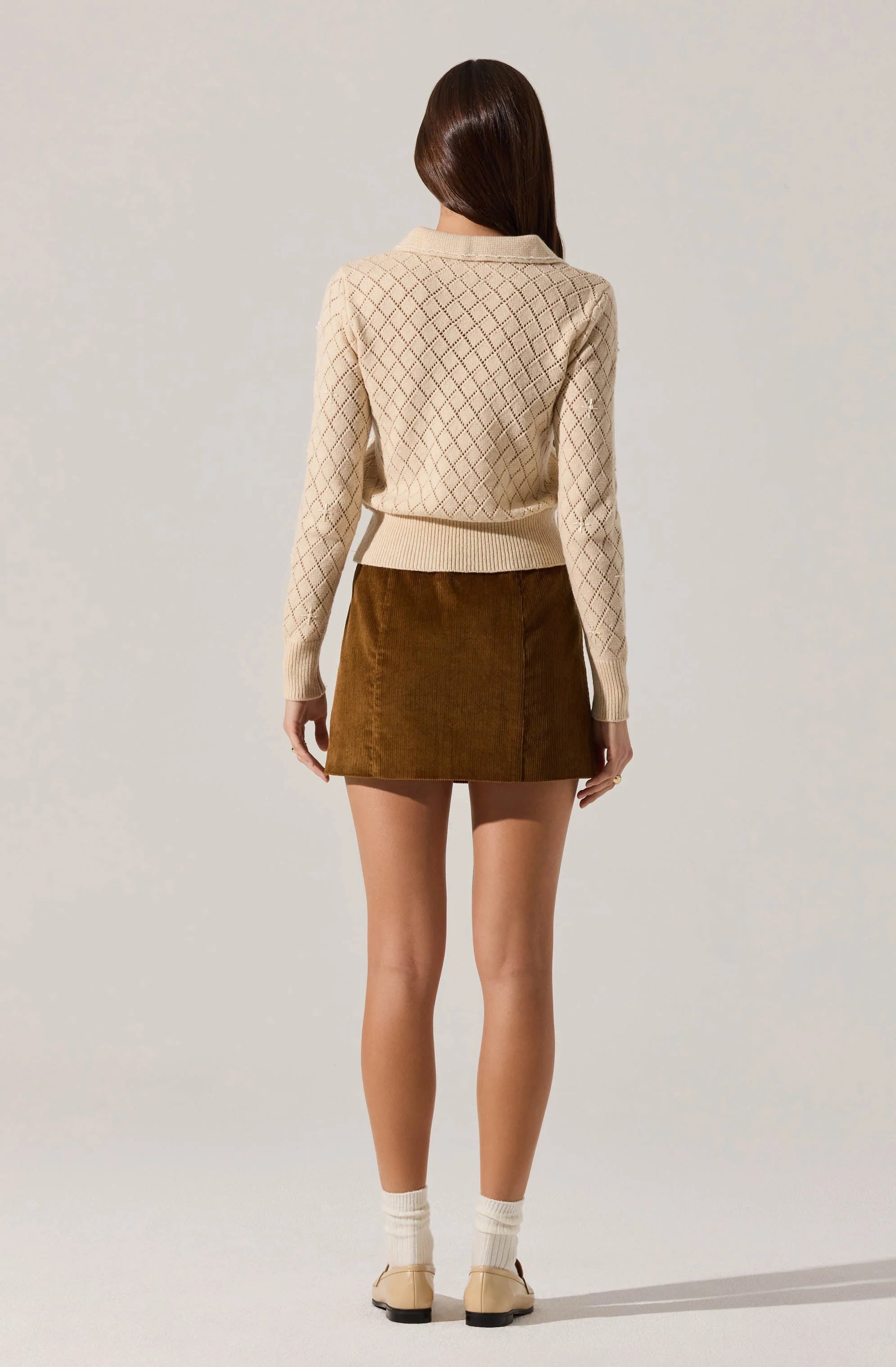 This camel corduroy mini skirt features a mid-rise silhouette and is fully lined for comfort. It includes decorative faux front pockets and a concealed center front zipper with a hook and eye closure for a sleek finish.