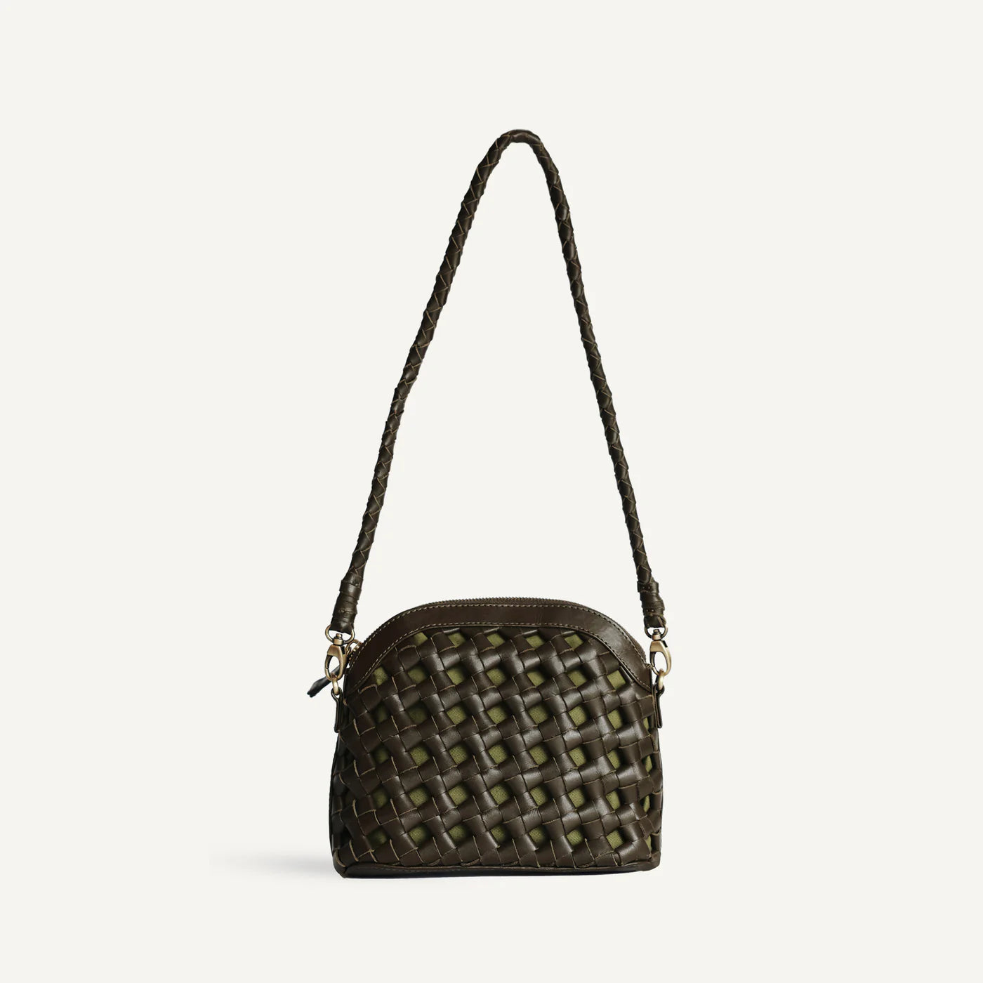 Mini arched-shape bag made from handwoven knotted leather. It features a zip top and removable shoulder strap, and comes with two interchangeable straps.
