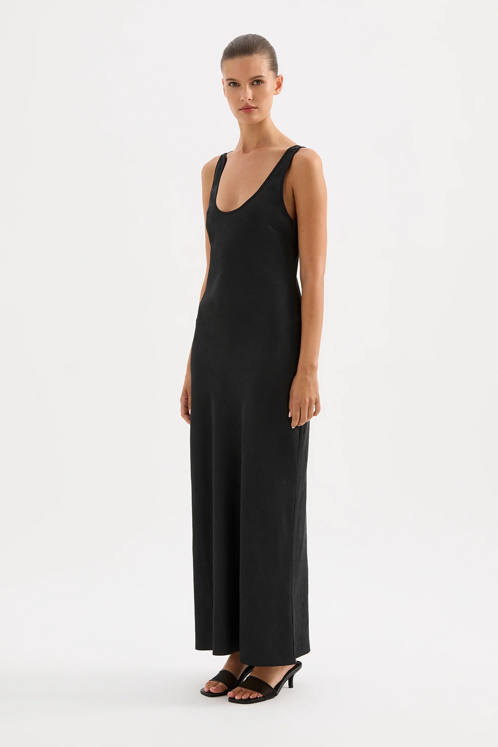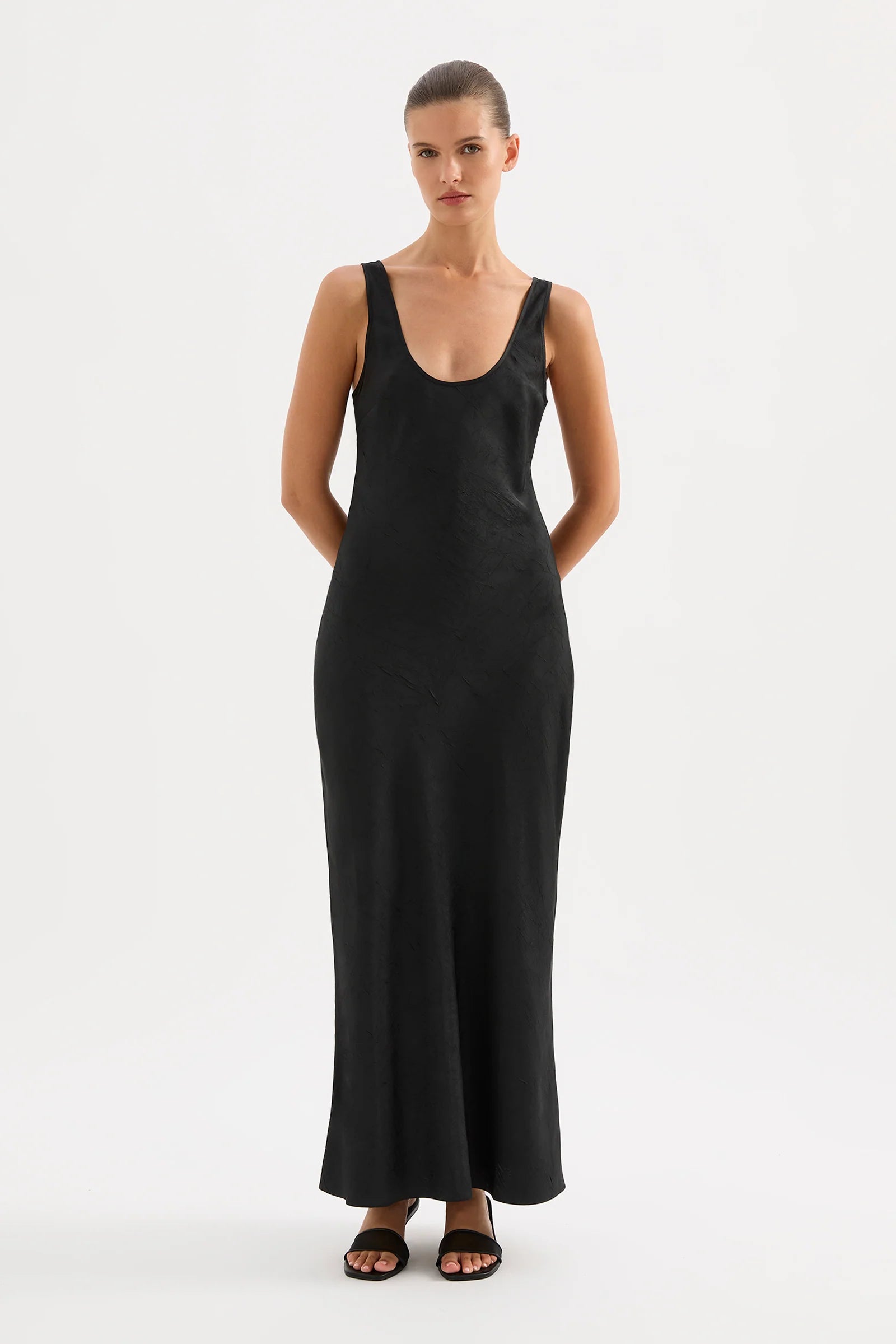 The Pandora Dress is made from a premium crushed satin featuring a luminous, gloss finish and subtle texture. Cut on the bias, this silhouette drapes over the body softly and finishes at ankle length. Features include a scoop neckline and thick straps.