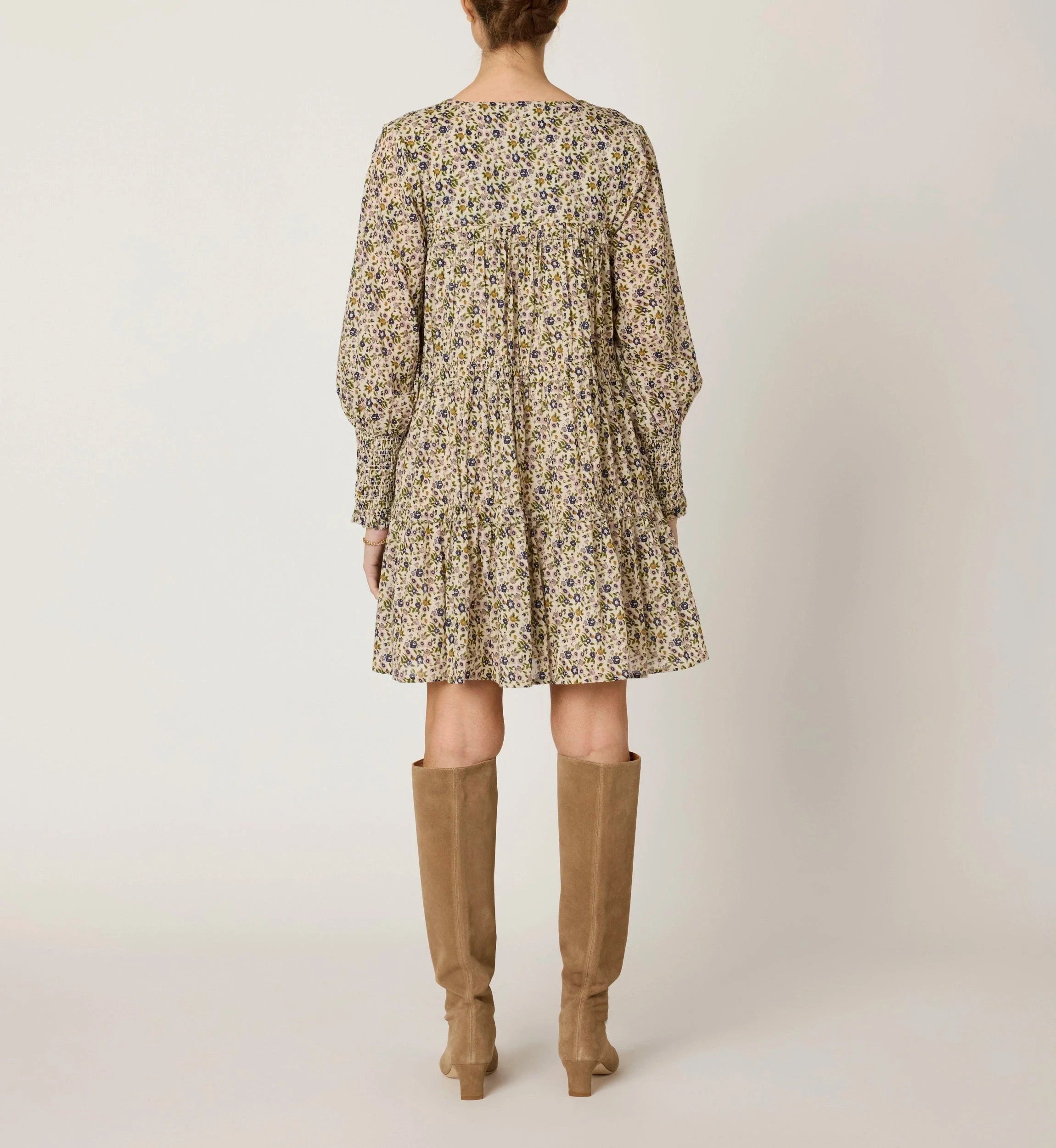 The Raquel Mini Dress is a timeless wardrobe staple that combines sustainability with effortless style. This feminine mini dress features delicate baby ruffle tiers, a shirred silhouette, and smocked cuffs for a flattering, comfortable fit. Finished with a tassel-tie neckline, it’s the perfect piece to wear from day to night.
