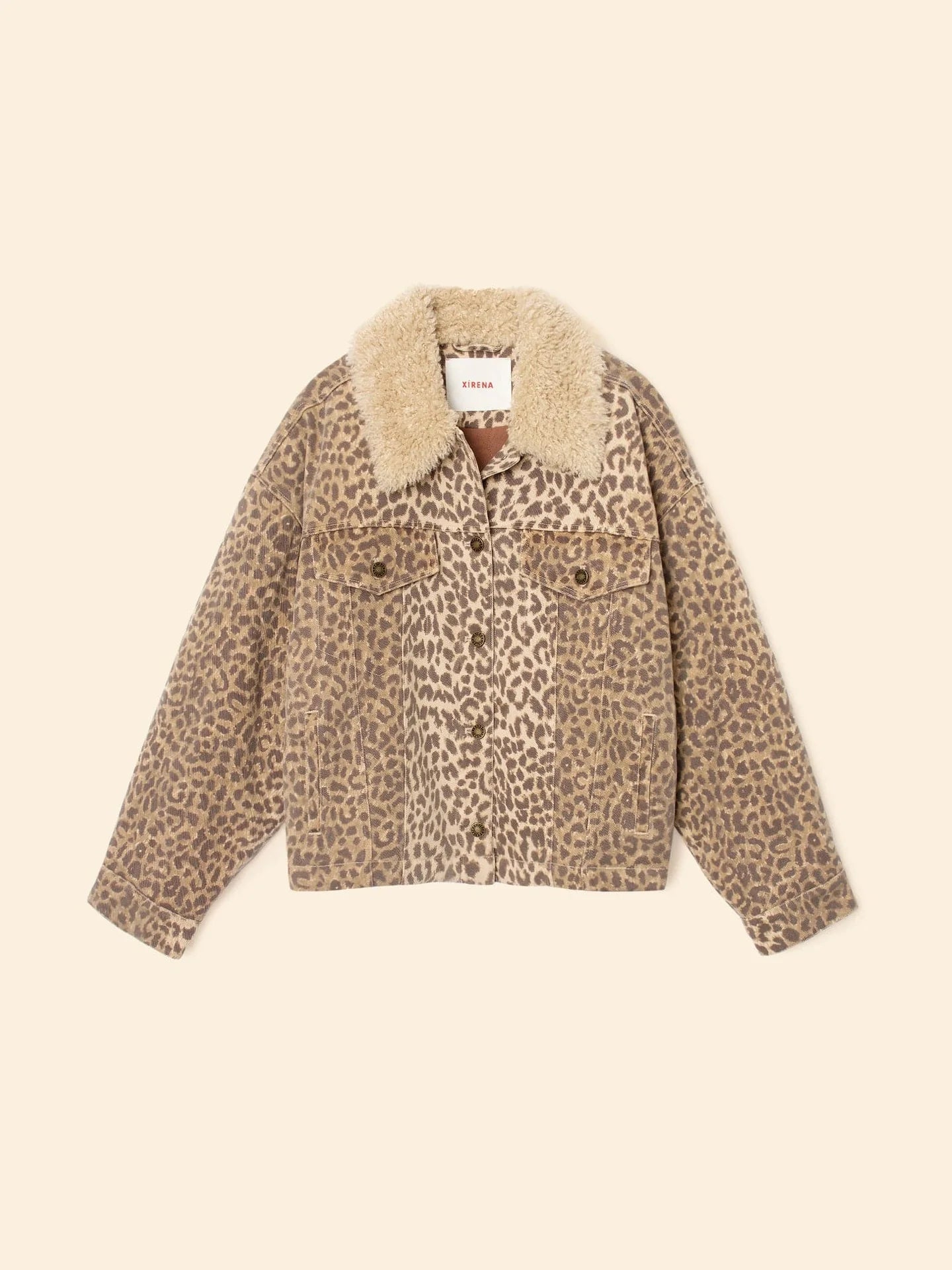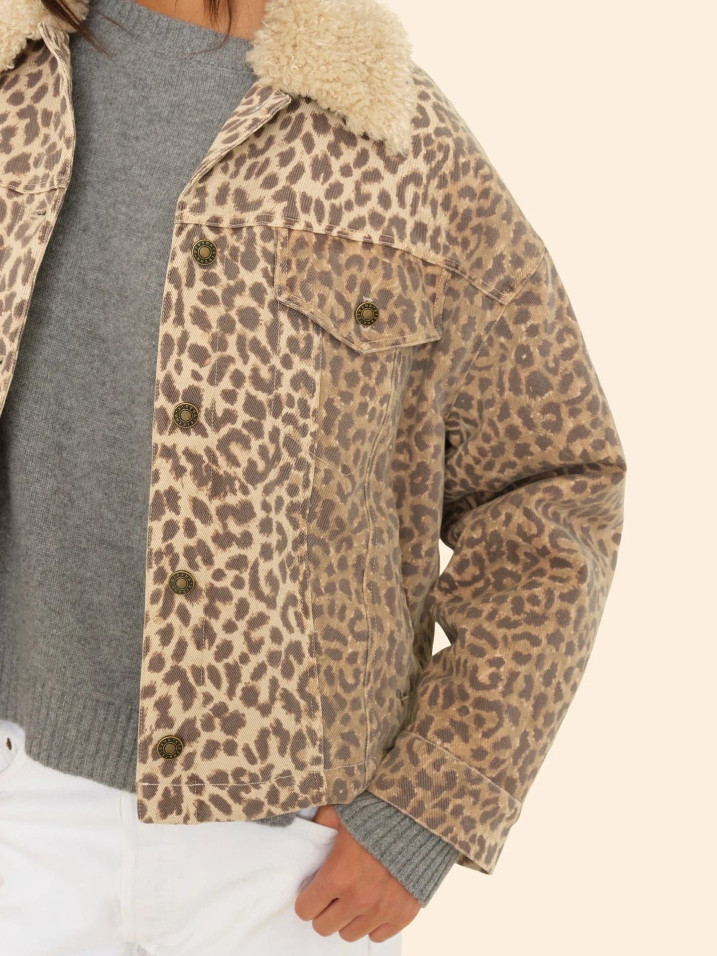 Ryko is an oversized denim jacket in leopard printed denim that is fully lined and features a faux fur collar, button flap chest pockets, and side welt pockets.