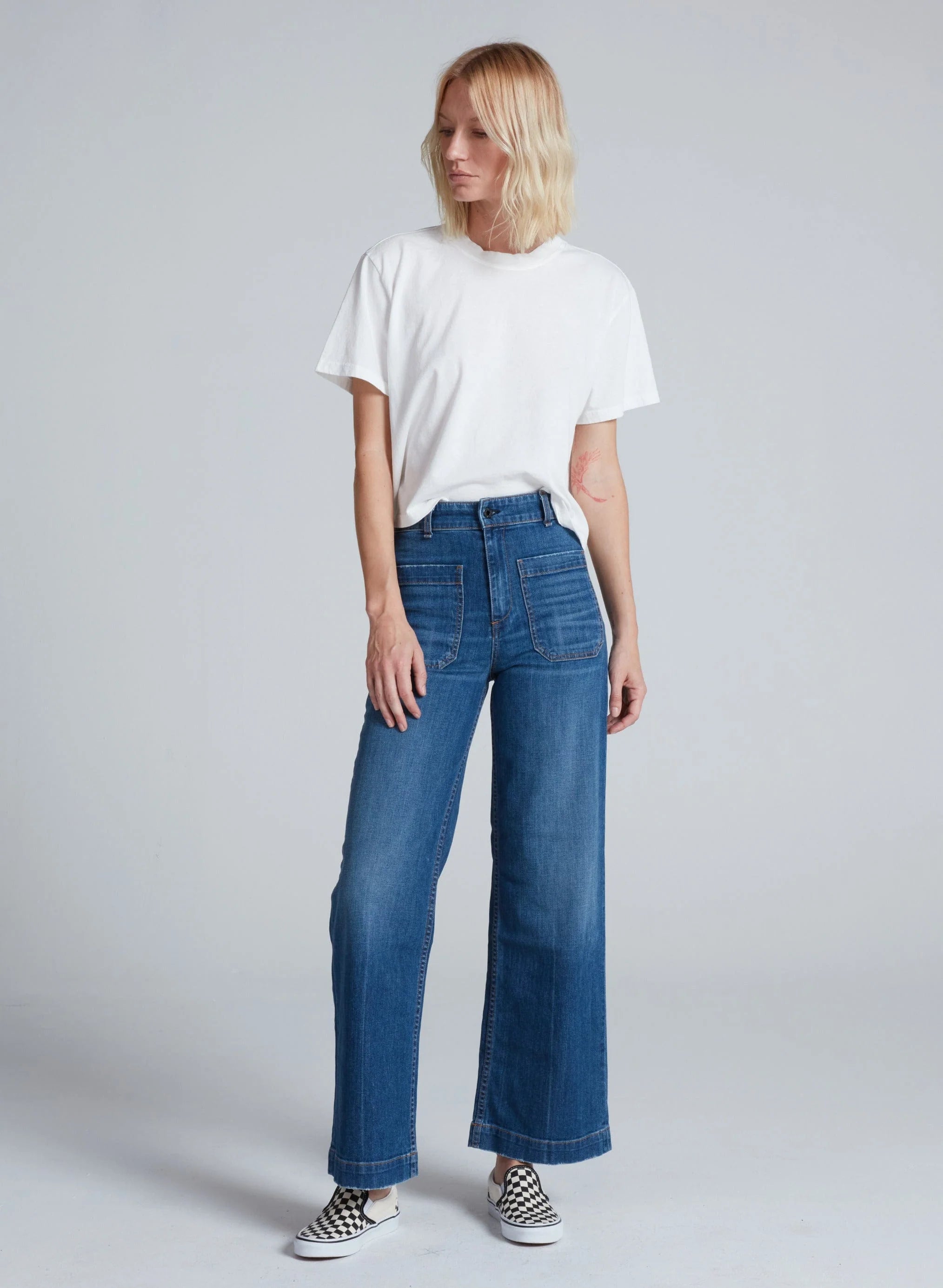 The Sailor Pant combines vintage inspiration with modern shape—featuring a high rise, slightly cropped wide leg, and clean patch pockets. Gunnison is a deep, rich indigo with soft fading through the thigh. Made in Los Angeles of 10 ounce Japanese stretch denim. 11.5 inch rise, 32 inch inseam, 22 inch leg opening.