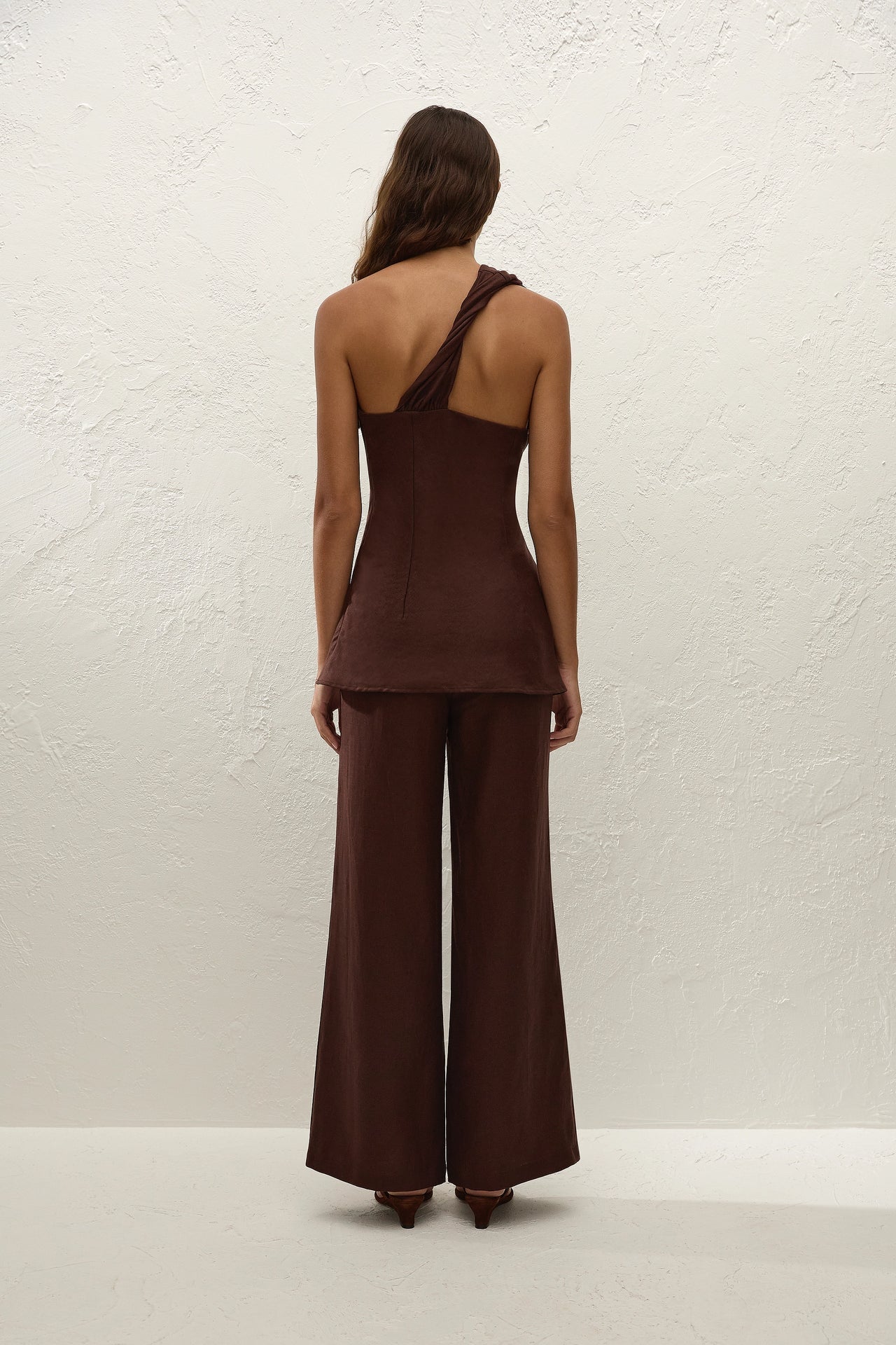 A softly tailored high-rise pant, designed from linen in a deep shade of carob brown. Fitted through the waist with a smooth front, they fall into a refined, yet relaxed wide leg that flares at the hem and crops around the ankles.